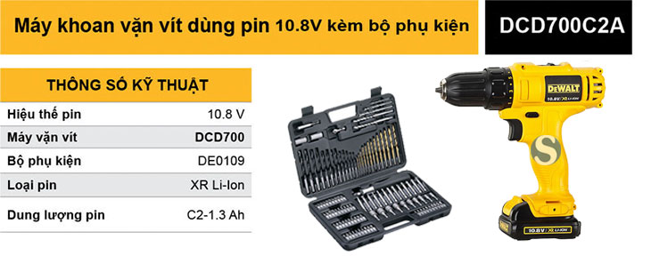 Hiệu điện thế của máy là 10.8V, DeWalt DCD700C2A sử dụng loại pin XR Li-Ion, là loại pin nhỏ gọn, dung lượng cao, thời gian sử dụng lâu. Pin không bị chảy nước dù sử dụng trọng thời gian dài.